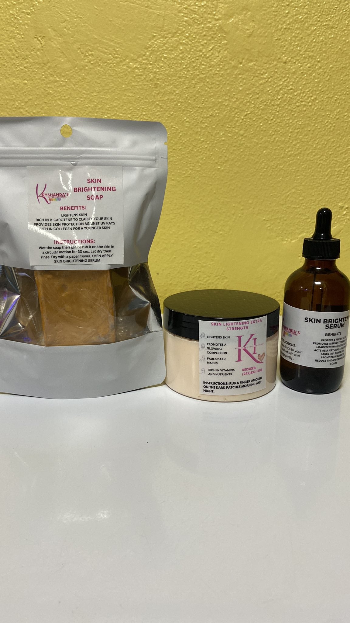 Discover the transformative power of the Skin Brightening Kit, designed to reveal a radiant and even complexion. This complete set features a brightening creme, serum, and soap that work together to gently lighten dark spots, reduce discoloration, and enhance skin clarity. Ideal for daily use, it helps promote a smooth, glowing look while nourishing your skin deeply. Embrace a brighter, more confident you with this essential skincare trio.